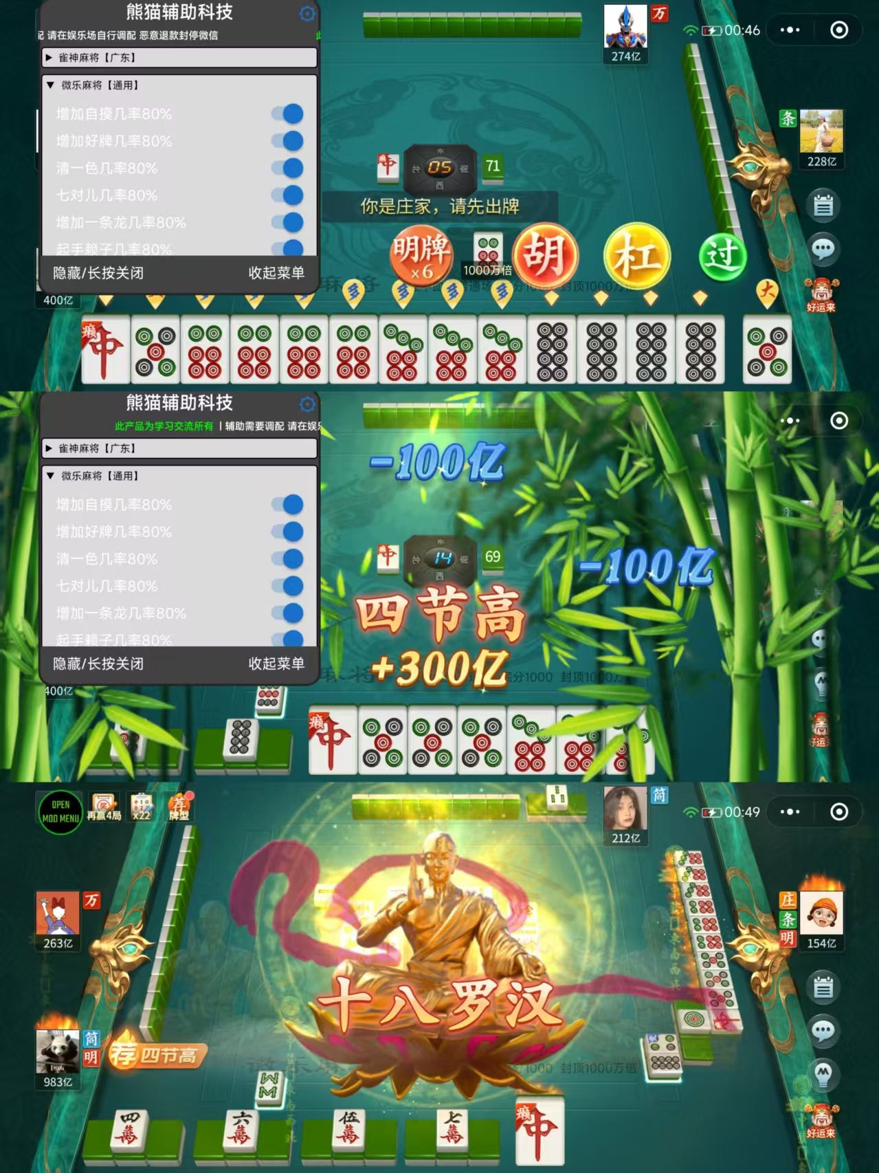 微信小程序棋牌麻将插件外挂 功能: 透视,换牌,必赢,必输,给指定人发牌